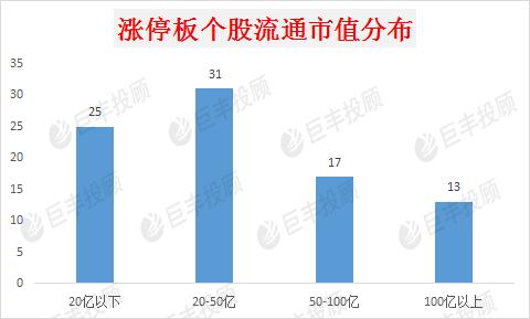 从流通市值的角度看,中小流通市值仍是出现涨停股数量最多的区域,并且今天这种现象还相对集中,今天50亿以下流通市值的个股数量达到56家,其中只有25家企业的流通市值在20亿以下,流通市值在50-100亿之间的个股数量今天出现17家,流通市值超百亿的个股出现13家。