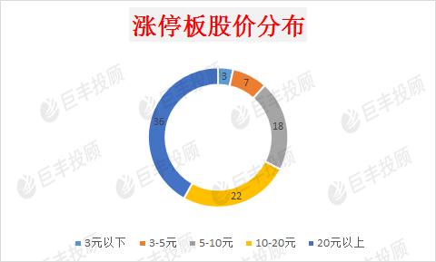 在降准利好的影响下,加之网红经济+次新股+股权转让等概念的集体走强,今天涨停板个股数量明显增加,这些涨停股的股价分布也有了方向。今天10元以上的中高价股,有58只个股涨停,其中股价在20元以上的个股数量为36只,10元以下的涨停股为28只,其中股价在5元以下的涨停股数量为10只。