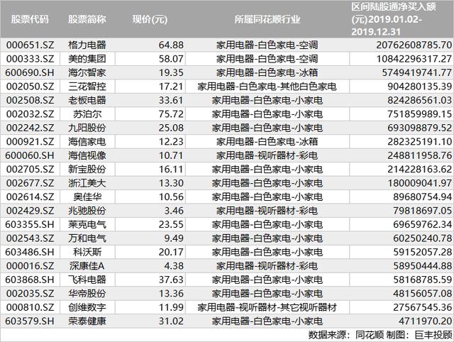 截至2019年12月31日,北上资金净买入格力电器207亿,美的集团108.4亿,海尔智家57.5亿,三花智控、老板电器、苏泊尔、九阳股份超过5亿元。