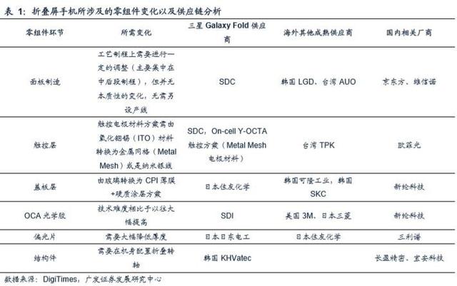 从目前来看,三星已推出两款折叠屏手机,分别是Galaxy Fold和明年即将上市的三星Galaxy Fold 2,华为折叠屏手机Mate X已经上市,明年也将推出第二款折叠屏手机 Mate X2,而苹果尚未公布其折叠屏手机的样式,但基本上与三星折叠屏手机Galaxy Fold类似设计,折叠处采用的是铰链进行连接,内部是一块8英寸的显示屏,外部的显示屏则在5英寸。随着苹果、华为、三星三家电子巨头的竞争的加剧,作为折叠屏上游的显示材料以及面板制造企业有望因此受益。