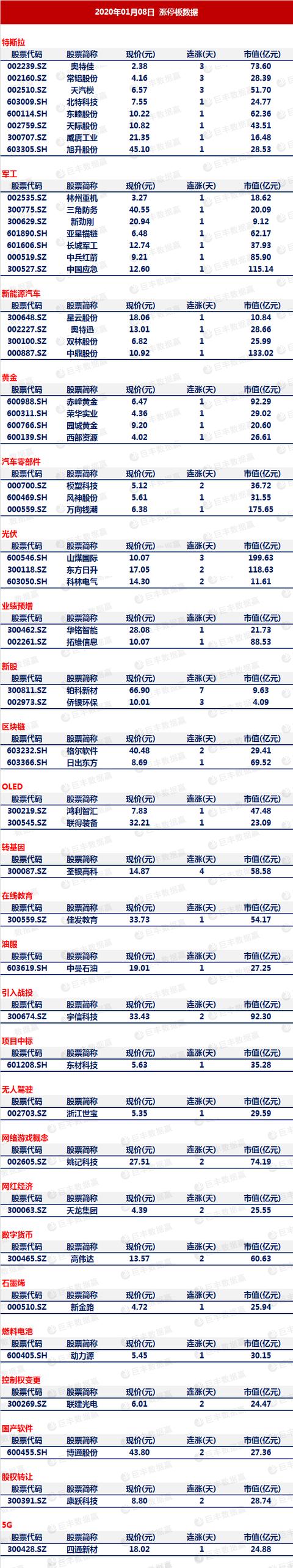 巨丰投顾认为最近2个月大金融、强周期、科技股三者轮动,带动市场重心抬高,在11月PMI指数转暖后开启跨年反弹行情。步入2020年后科技股和大金融逐步淡出,新能源汽车成为市场新的上行动力。周三盘前中东局势再度紧张,黄金、原油大涨,受此影响市场谨慎情绪上升,A股顺势展开调整;特斯拉概念全线拉升,并带动充电桩走高,另外MINILED和农业服务板块也有不错的表现,金融股是制约指数表现的主要做空力量。预计回补年内缺口后,大盘将继续上行。操作上,建议继续关注底部蓝筹和新能源汽车板块。
