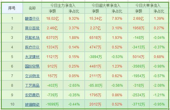 从两市行业板块资金流向来看,酿酒板块主力资金净流入18.02亿,商业百货板块主力资金净流入2.46亿,民航机场板块主力净流入6370万,医疗板块主力资金净流入1334万,水泥建材行业主力净流入1121万,从市场个股资金流向来看,获得主力资金净流入排名前十情况如下: