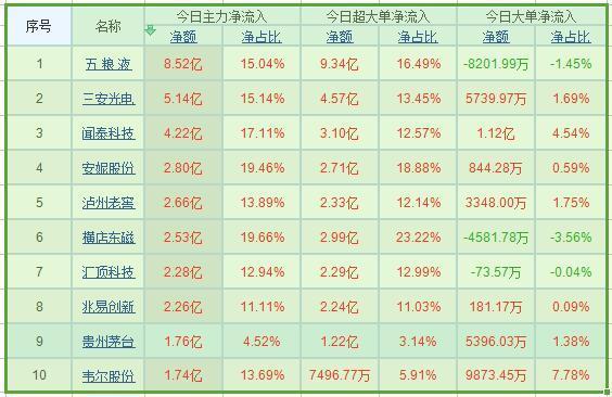 从两市个股主力资金流向来看,五粮液获得主力资金净流入8.52亿,三安光电获主力资金5.14亿净流入,闻泰科技获主力资金净流入4.22亿,安妮股份获主力资金净流入2.80亿,泸州老窖获主力资金净流入2.66亿,横店东磁获主力2.53亿净流入。