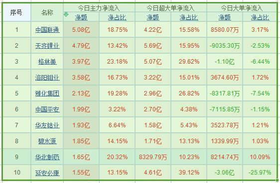 从两市个股主力资金流向来看,中国联通获得主力资金净流入5.08亿,天齐锂业获主力资金4.79亿净流入,格林美获主力资金净流入3.97亿,洛阳钼业获主力资金净流入3.58亿,雅化集团获主力资金净流入2.13亿,中国平安获主力1.99亿净流入。