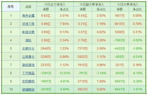 从两市行业板块资金流向来看,有色板块主力资金净流入6.62亿,环保板块主力资金净流入5.89亿,电信运营板块主力净流入3.69亿,保险板块主力资金净流入2.00亿,化肥行业主力净流入2948万,从市场个股资金流向来看,获得主力资金净流入排名前十情况如下: