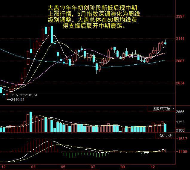 大盘19年1月份刷新阶段低点后开启周线级别的上涨行情。从走势上看,大盘周线黄白线在MACD零轴线上方,中线上涨趋势延续,但持续在60周均线之获得支撑后市场依然为中期震荡格局。