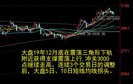 短期来看,大盘12月底展开的跨年度行情收获超过200点的指数涨幅。一方面,连续3个交易日的短线调整之后,大盘5日、10日两条短期均线已经拐头向下,5日、10日均线粘合,20日均线暂且继续向上,跳空上涨缺口成为强支撑,显示市场强势状态;另一方面大盘日K线,MACD在零轴上方已由红柱翻绿,呈现调整格局。总体来说,此次短线调整有转化为日线调整的可能,反弹之后可能继而转化为周线震荡格局中的调整态势。
