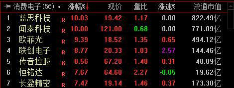 消费电子类题材再度活跃,盘中无线耳机、苹果概念、小米概念、华为概念等题材走强,闻泰科技、蓝思科技强势封板,立讯精密、信维通信、恒铭达、歌尔股份、中京电子、乐心医疗、赛腾股份、亿纬锂能、圣邦股份等个股盘中全线拉升走强,盘中整个电子类题材股呈现全线活跃。