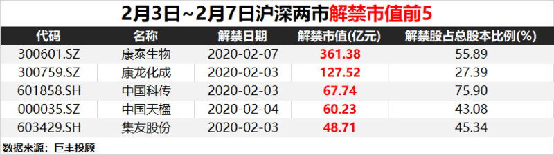 解禁市值超过百亿元的个股有两2家,分别是康龙化成和康泰生物。