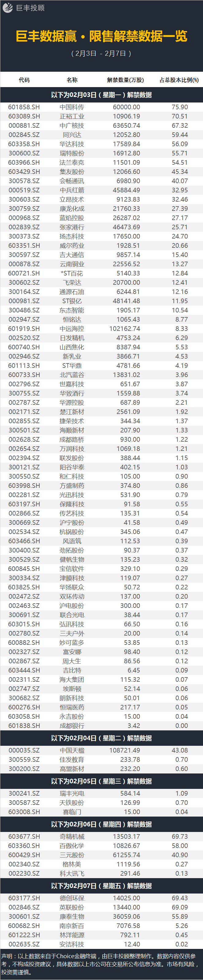 下一周(2月3日~2月7日)共有86家上市公司解禁,共计解禁市值1277.27亿元。