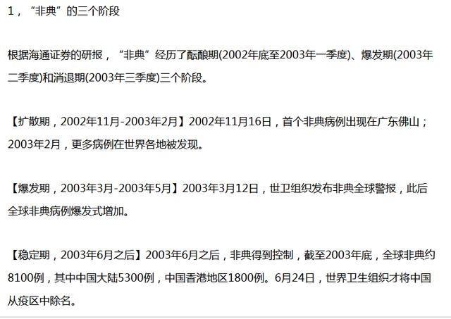 A股是不是已经摆脱了疫情的影响了呢?现在还不能这么乐观。以史为鉴,根据海通证券的研报,“非典”经历了酝酿期(2002年底至2003年一季度)、爆发期(2003年二季度)和消退期(2003年三季度)三个阶段。