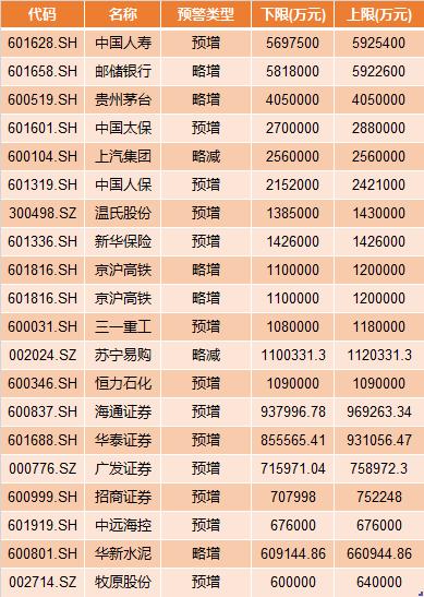 在预喜盈利超过10亿180家公司中,中国人寿净利润预期最高,盈利区间在569.75-592.54亿元,相比上年最大变动幅度为420%。其次,邮储银行邮储银行净利润增长也很高,盈利区间在581-592亿元,相比上年同期增长16.55%至18.64%。