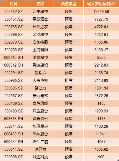 从业绩增速上看,业绩增长超过10倍的股票有19家上市公司,其中万集科技最大增幅138倍、星徽精密最大增幅77.27倍、居然之家最大增幅47.2倍、金溢科技最大增42倍,宏创控股最大增幅41倍,目前有365家上市公司净利润涨幅翻倍。