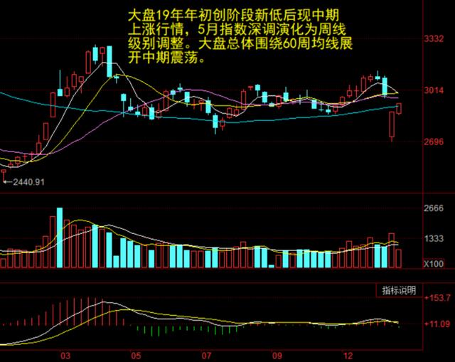 大盘19年1月份刷新阶段低点后开启周线级别的上涨行情。从走势上看,大盘周线黄白线在MACD零轴线上方,中线上涨趋势延续,但短期调整使市场在60周均线上方的强势震荡行情转为围绕60周均线的中期弱势震荡格局。