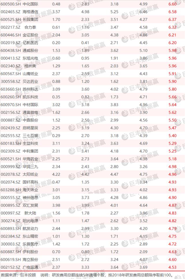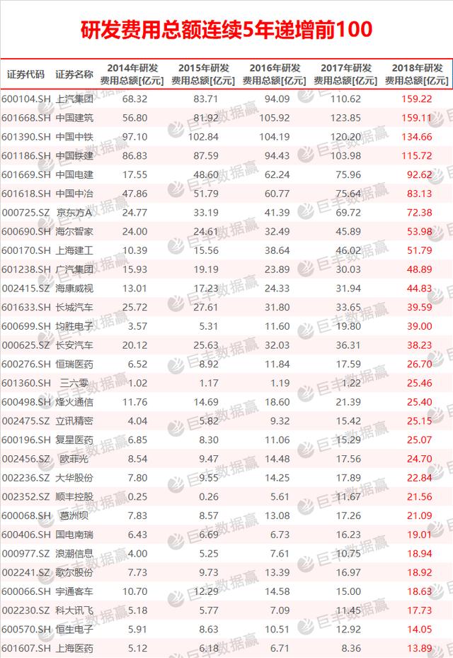 说明:研发费用总额连续5年递增个股,按2018年研发费用总额降序取前100。