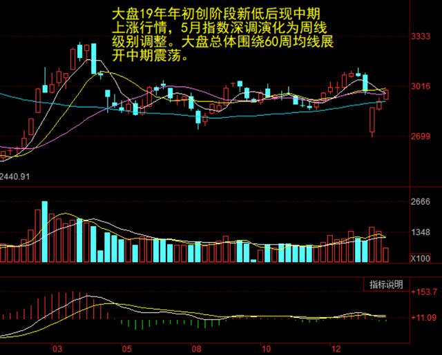 大盘19年1月份刷新阶段低点后开启周线级别的上涨行情。从走势上看,大盘周线黄白线在MACD零轴线上方,中线上涨趋势延续,但短期调整使市场在60周均线上方的强势震荡行情转为围绕60周均线的中期弱势震荡格局。