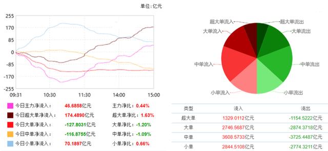 根据东财统计,截止收盘沪深两市呈现资金净流入状态,当日沪深两市资金净流入46.69亿元,今日超大单净流入174.49亿元,大单净流出127.80亿元,中单净流出116.88亿元,小单净流入70.19亿元。