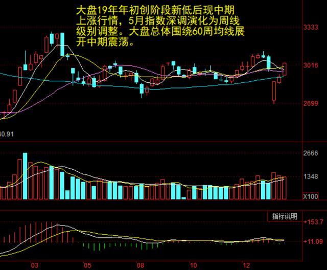 大盘19年1月份刷新阶段低点后开启周线级别的上涨行情。从走势上看,大盘周线黄白线在MACD零轴线上方,中线上涨趋势延续,但短期调整使市场在60周均线上方的强势震荡行情转为围绕60周均线的中期弱势震荡格局。