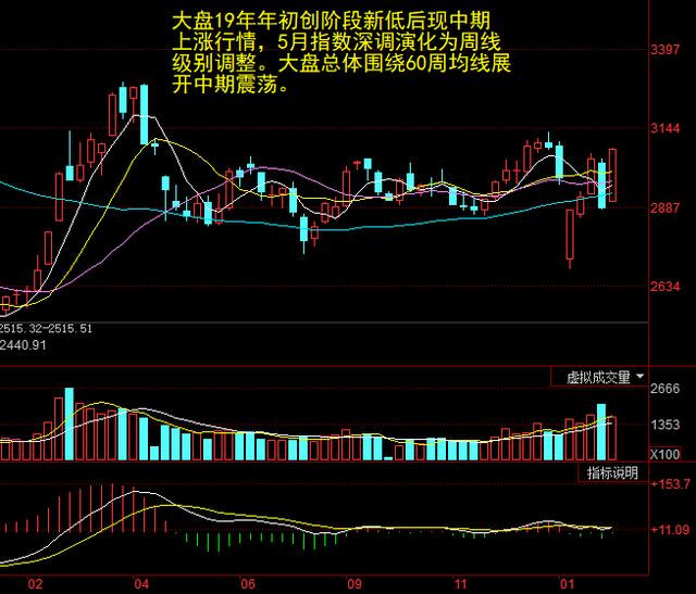 大盘19年1月份刷新阶段低点后开启周线级别的上涨行情。从走势上看,大盘周线黄白线在MACD零轴线上方,中线上涨趋势暂时转变为围绕60周均线的中期震荡格局。