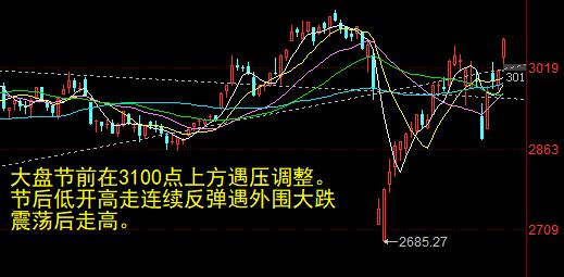 短期来看,大盘节前超过200点的上涨行情由于疫情影响已由调整转为下跌行情。在一次性大幅低开后,市场开启强势反弹行情,受外围大跌影响,沪指震荡后继续回升,目前MACD已站上零轴,市场进入多头市场。期待两市上涨空间进一步拓展,但要注意3100点附近压力。