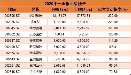 除了克明面业,业绩正增长的还有17家上市公司。另外姚集科技、安纳达最大变动幅度超过200%,华力创通、安心医疗等5家上市公司业绩翻倍,业绩非常优秀。