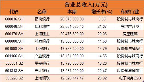 具体来看,营收最大的仍然是银行和房地产。招商银行营业收入2697.5亿,暂时居首,另外营收增长也有8.53%,目前市盈率只有8.8倍,怎么看也是低估的。另外像保利地产、上海建工、光大银行、上海钢联也保持了千亿营收,同时增速达到了20%以上,非常惊人。