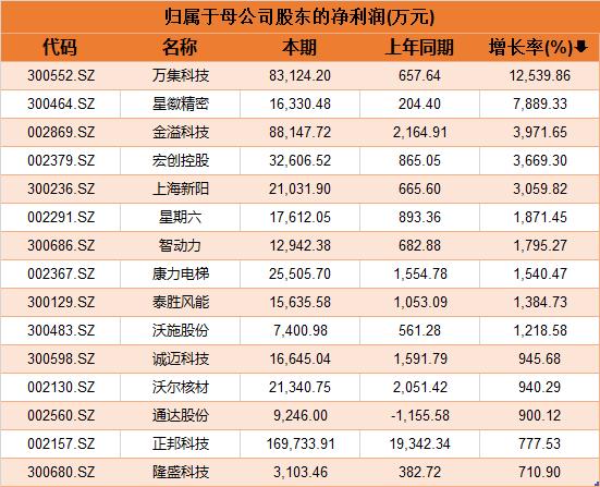 从净利润的变化看,万集科技和星徽精密的增长幅度最大,分别增长125倍和78倍,主要是上年的基数太小,后面增长超10倍的也均有这个问题。正邦科技净利润增长7.7倍,属于业绩正常增长,根据公告,业绩上涨是由生猪价格大幅上涨所致。