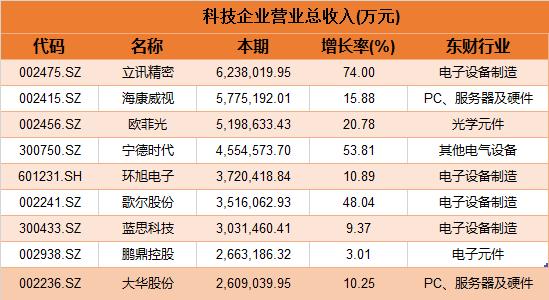 重点看一下科技类企业的情况。立讯精密不仅营收达到623亿,增长率也达到了74%的高增速,业绩超预期,难怪能成为科技企业里面的长牛股。另外,宁德时代和歌尔股份增速也非常高,分别增长了53.81%和48.04%,业绩非常突出。