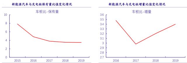 不过车桩比3.5:1远低于《电动汽车充电基础设施发展指南(2015-2020)》规划的 1:1。根据《新能源汽车产业发展规划(2021-2035 年)》(征求意见稿)规划,到 2025 年新能源汽车销量占汽车销量的 25%左右,保守预计新能源汽车销量 700 万辆左右。新时代证券以新能源汽车保有量 2000 万辆、车桩比 1:1 估算,需要的充电桩数量约 1880 万台。由于交流桩和直流桩价差大,假设充电桩均价 1.5 万元/台计算,对应的充电设备市场空间约 2800 亿元。充电桩的加速投资将拉动充电设备需求显著增加,带动相关产业链公司收入和利润增长。