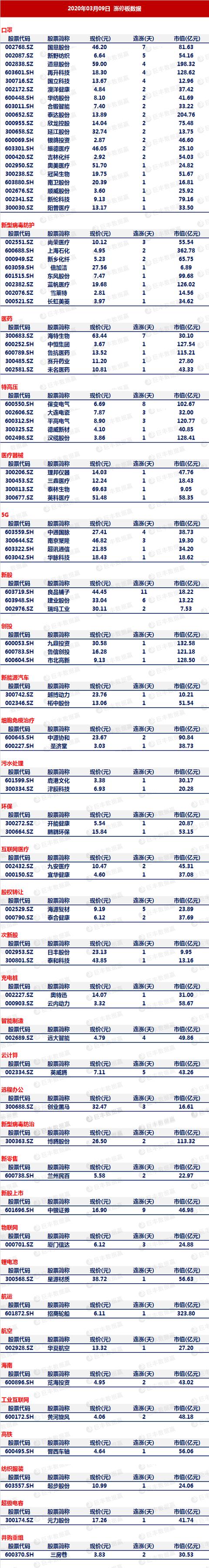 口罩板块拉升:国恩股份、新野纺织、再升科技、英科医疗、道恩股份、银鸽投资、南京聚隆、澳洋健康、泰达股份、蓝帆医疗、振德医疗、南卫股份、锦泓集团、新野纺织等近20股涨停。超级真菌板块持续拉升,泰合健康、鲁抗医药涨停,海王生物、未名医药、海正药业、康芝药业等跟涨。