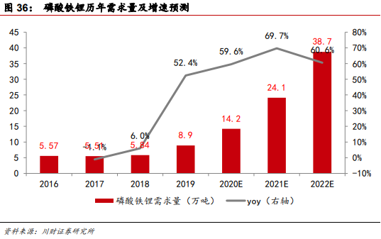 随着磷酸铁锂优势的进一步显现,产业链需求有望回暖,供需格局有望改善,预测磷酸铁锂 2020~2022的需求量分别为14.2万吨、24.1万吨和38.7万吨,对应对应行业增速为59.6%、69.7%、60.6%。