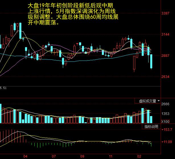 大盘19年第一季度的上涨行情转变为围绕60周均线的中期震荡行情。受外围暴跌影响,大盘短线走弱带动周线MACD黄白线将进入零轴下方,不过预计无需紧张,很大可能只是蜻蜓点水。