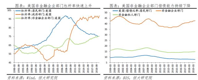 上图我们可以看到,除了居民杠杆率在08年之后出现下降后,美国的政府部门和非金融企业的杠杆率都呈现出上升趋势。这也就意味着企业和政府的杠杆情况是比较高的,而右边的图是他们的偿还能力,从图中可以看到,不管是居民还是非金融私人部门,他们的偿还能力都是下降的,或者说是相对偏低的,即使是非金融企业,他们的偿债能力也没有次贷危机之前的偿债能力高。