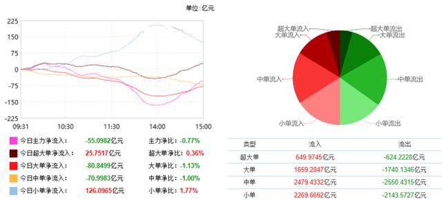 根据东财统计,截止收盘沪深两市呈现资金净流出状态,当日沪深两市资金净流出55.10亿元,今日超大单净流入25.75元,大单净流出80.85亿元,中单净流出71.00亿元,小单净流入126.10亿元。