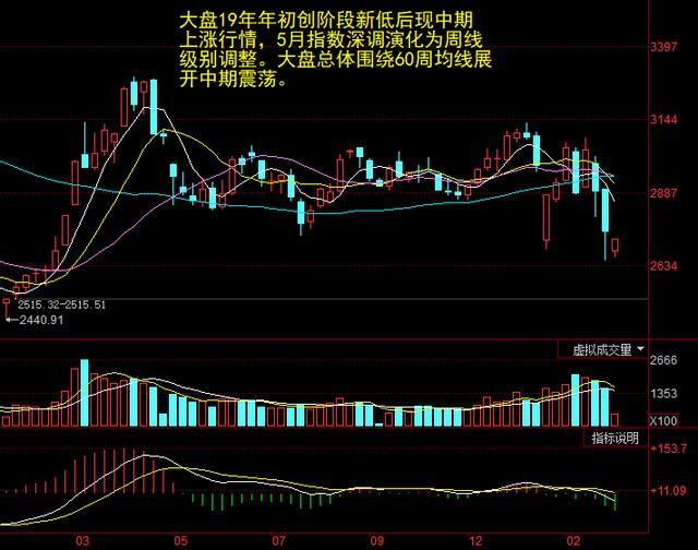 大盘19年第一季度的上涨行情转变为围绕60周均线的中期震荡行情。受外围暴跌影响,大盘短线走弱带动周线MACD黄白线将进入零轴下方,不过预计无需紧张,很大可能只是蜻蜓点水。
