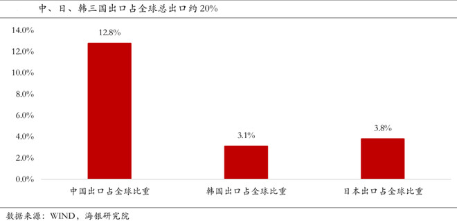 年中、日、韩三国出口总量大约占全球总出口的20%左右,尤其是日韩,是电子产业的重要参与者,其企业生产会受到影响,这可能加剧全球制造业供应链紧张。