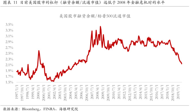 首先,我们用股市融资余额占流通市值比重衡量股市的杠杆率,可以看到,美国股市的杠杆率和2008年危机前相比大幅降低。在2008年危机发生之前,美股融资余额/标普500的比例从2006年初的2.3%左右一路攀升至2008年3.5%左右,但是目前美股的杠杆率自2018年以来一直处于下降趋势,目前水平基本在次贷危机发生前水平。