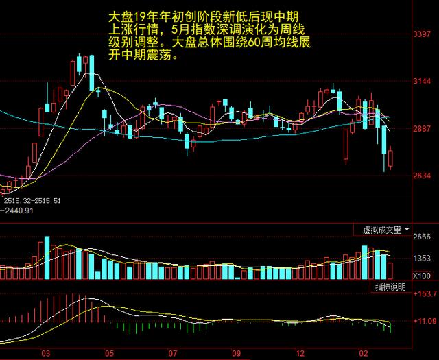 大盘19年第一季度的上涨行情转变为围绕60周均线的中期震荡行情。受外围暴跌影响,大盘短线走弱带动周线MACD黄白线将进入零轴下方,不过预计无需紧张,很大可能只是蜻蜓点水。