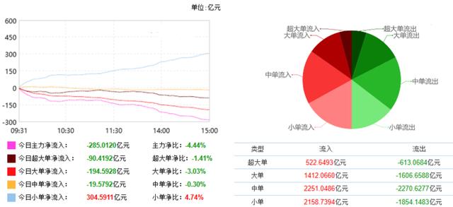 根据东财统计,截止收盘沪深两市呈现资金净流出状态,当日沪深两市资金净流出285.01亿元,今日超大单净流出90.42元,大单净流出194.59亿元,中单净流出19.58亿元,小单净流入304.59亿元。