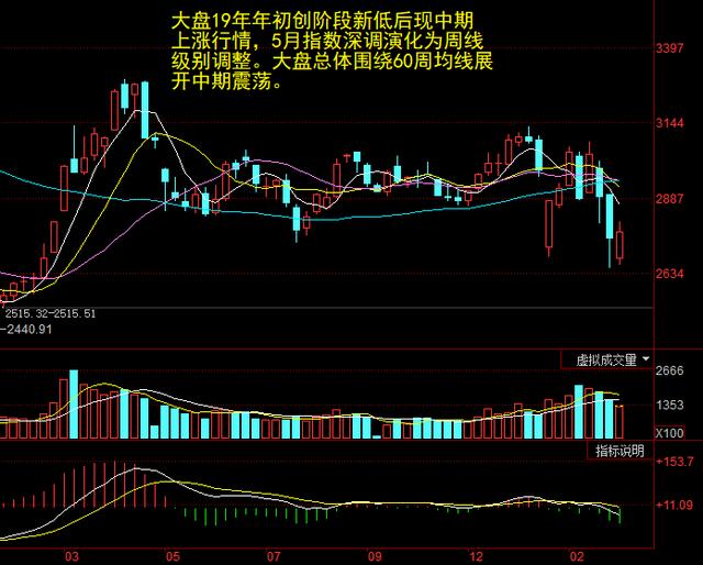大盘19年第一季度的上涨行情转变为围绕60周均线的中期震荡行情。受外围暴跌影响,大盘短线走弱带动周线MACD黄白线将进入零轴下方,不过预计无需紧张,很大可能只是蜻蜓点水。