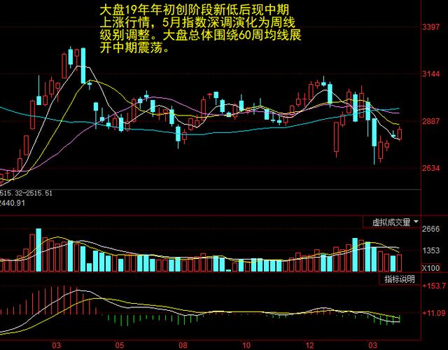 大盘19年第一季度的上涨行情转变为围绕60周均线的中期震荡行情。受外围暴跌影响,大盘短线走弱带动周线MACD黄白线将进入零轴下方,不过预计无需紧张,很大可能只是蜻蜓点水。