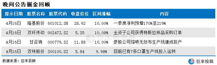 目前是上市公司发布2019年年报及分红预案的密集时点,这段期间不乏出现掘金机会。在4月16日的晚间十大重磅公告中提到的隆基股份、双环传动、甘咨询、双林股份四只个股喜获涨停。