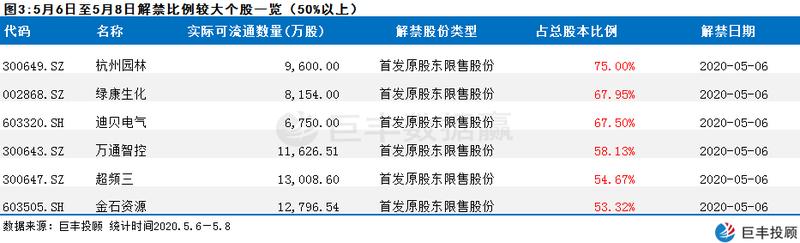 从解禁市值分布看,主要集中在周三,即五一假期后第一个交易日。个股方面,解禁比例超过50%的有6家,相比上周减少2家,其中解禁比例较大的个股主要有杭州园林、绿康生化和迪贝电气等。