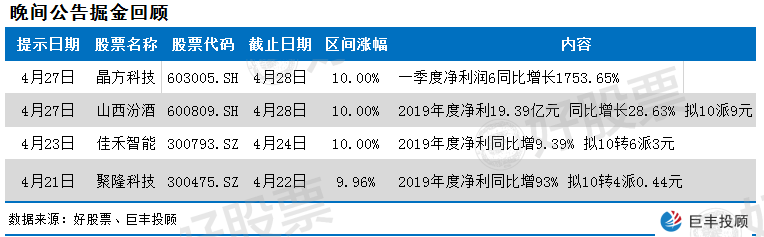 近日为A股市场一季报及年报分红预案密集发布期,27日晚间公告掘金栏目提及个股晶方科技、山西汾酒喜获涨停。