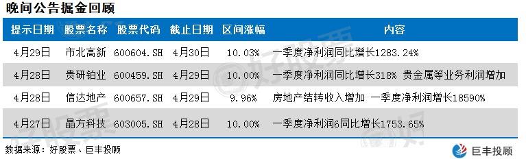 4月底A股市场一季报及年报分红预案发布进入收尾,29日晚间公告掘金栏目提及个股市北高新喜获涨停。