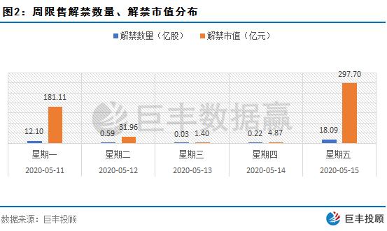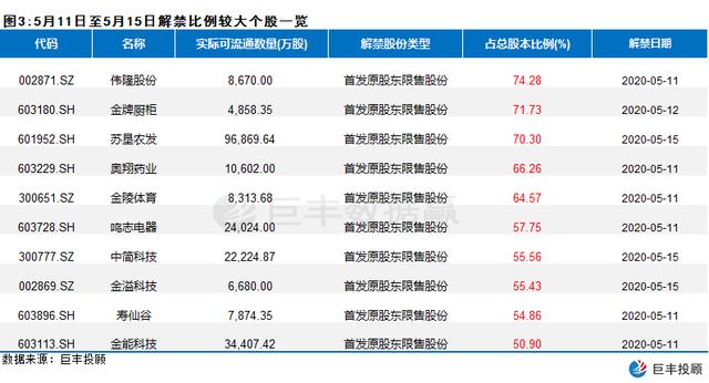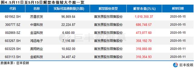 5月11日到5月15日共涉及31.03亿股、51家上市公司解禁,解禁市值合计约517.04亿元。解禁市值较上周增长112%。