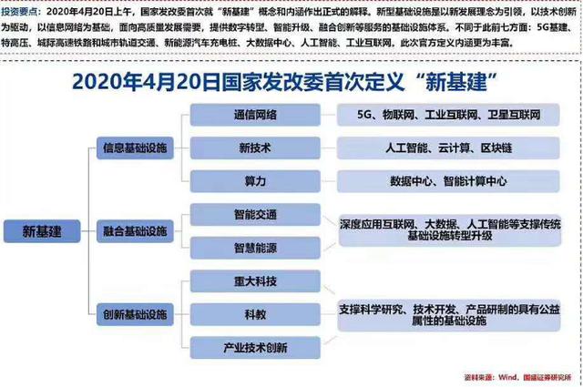 发改委4月20日新闻发布会首次明确新型基础设施的范围,主要包括三个方面,一是信息基础设施,二是融合基础设施,三是创新基础设施。共涉及通信网络、新技术、算力、智能交通等8大领域。