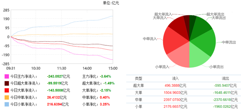 根据东财统计,截止收盘沪深两市呈现资金净流出状态,当日沪深两市资金净流出243.05亿元,今日超大单净流出99.55亿元,大单净流出143.50亿元,中单净流入26.41亿元,小单净流入216.64亿元。