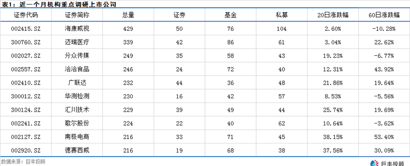 海康威视、迈瑞医疗、分众传媒、洽洽食品等上市公司是近一个月机构重点调研的公司。
