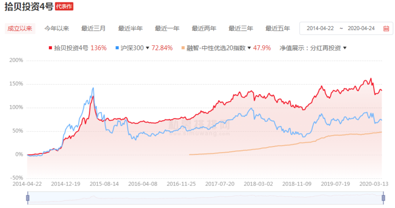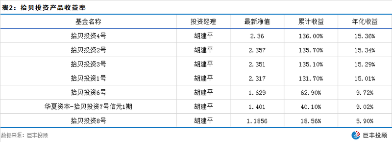 最出色的产品——拾贝投资4号,投资经理胡建平,累计回报率达到136%,年化收益15.36%,大幅超越沪深300的回报率72.84%。